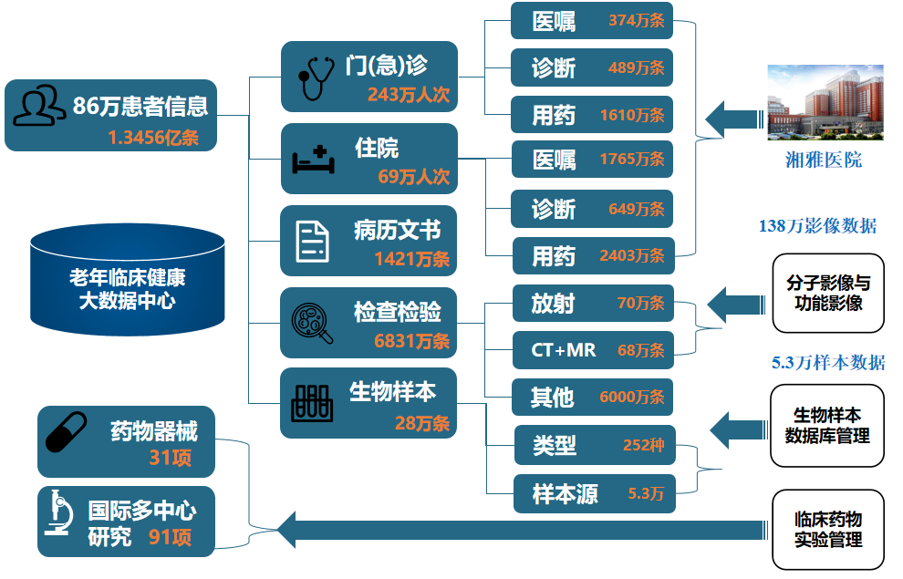 网络信息与大数据中心以临床数据采集、汇聚和质控管理为核心,为多中心临床研究项目提供数据基础,集数据汇聚、数据检索、数据治理和数据分析为一体,搭建了多中心数据管理、智能专病数据库、科研数据分析等公共平台。目前,平台依托中南大学湘雅医院的大数据资源、临床队列数据、专病库数据和协作创新单位数据四大数据来源,汇聚了标准规范的老年人群数据,并对接了临床数据资源和生物样本资源,与临床研究方法学中心和数据挖掘与应用中心一起广泛链接协作单位形成了一张“共建、共享、共用”的科研协作创新网络。